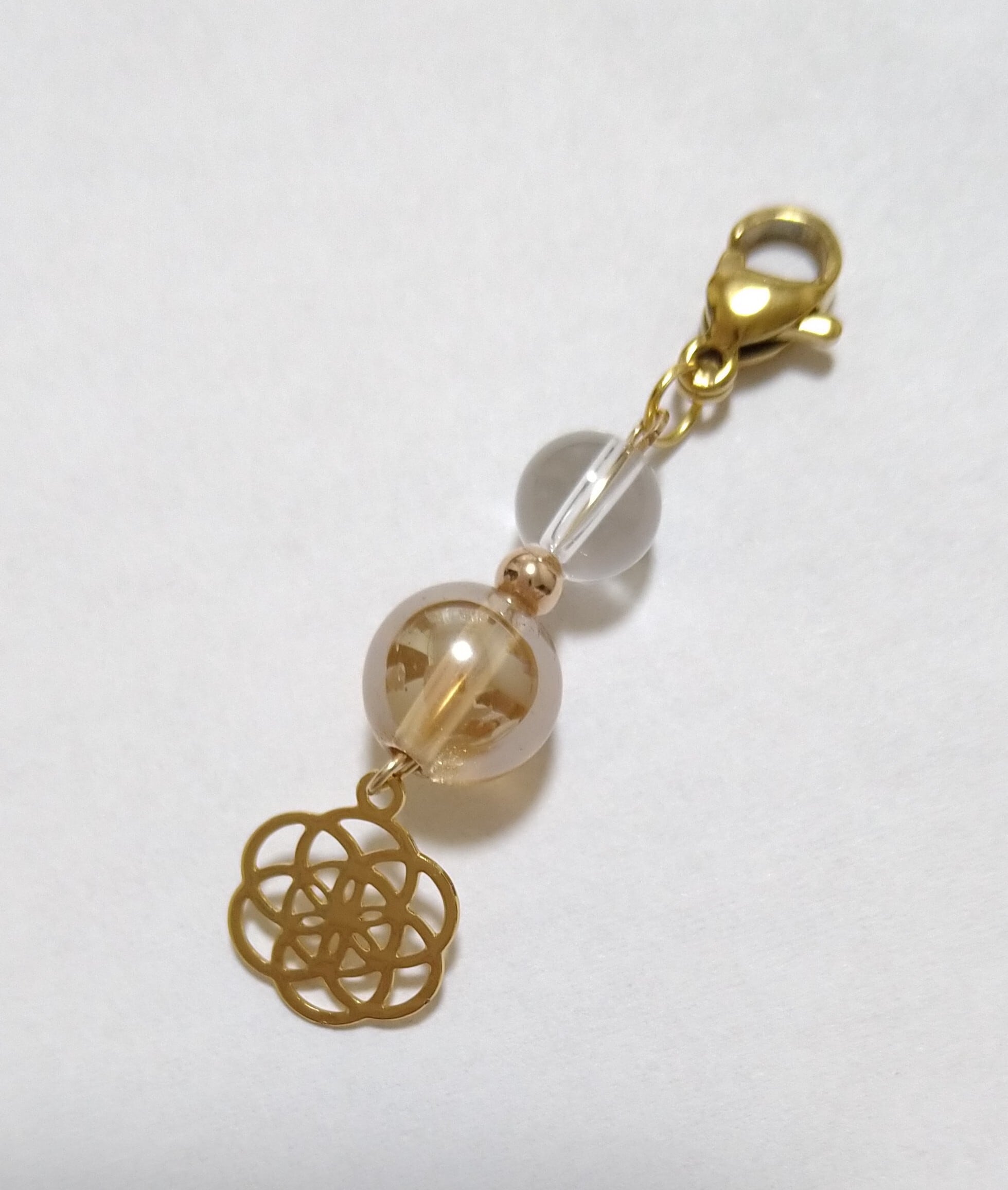 シードオブライフチャーム付きシャンパンカラークォーツ•クリスタル天然石マスクチャーム
